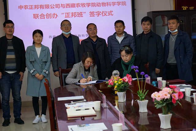 2020年5月14日上午,西藏农牧学院与正邦集团湖南中农正邦有限公司签订校企合作协议。湖南中农正邦有限公司人力资源总监黄燕玲、招聘副总监陈辉发、总裁秘书戴利君等三人,西藏农牧学院动物科学学院院长索朗斯珠、 学生工作处处长赵德军、教务处副处长姚学林及动物科学学院教师代表参加了合作协议签订仪式。