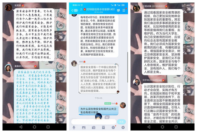 根据上级有关部门安排,各单位认真组织师生参加全民国家安全教育日特色活动。紧扣“千万师生同上一堂国家安全教育课”这一主题,分别以党组织、科室、班级、学生社团等为单位开展视频会议、主题“云”班会、在线党团活动等线上主题活动。组织所属师生通过“中国大学生在线”平台学习教育部录制的2020年全民国家安全教育日高校公开课,采取线上观学、记录笔记、在线讨论、留言点赞等形式,加强国家安全教育相关学习,师生们紧紧围绕总体国家安全观的主要内涵和基本要求,结合“国家安全就在你我身边”、“国家安全、人人有责、人人可为”、“维护国家安全,我们普通人能做什么” “疫情防控法治宣传”、“依法科学开展疫情防控”等内容展开热烈讨论。青年学生、教职员工还分别参与了由中国大学生在线等单位开展的国家安全知识在线问答,法治西藏平台学法风暴中的国家安全法律知识考试, 通过考试答题的形式检验学习成效、加深认识理解。