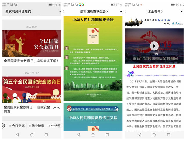 学院各单位以全民国家安全教育日为契机,充分利用校园网、新媒体、电子显示屏等平台编发推送主题内容,转发转载相关文章、微视频、音频、图解等,以强大的网络信息资源进行全方位宣传教育。重点宣传“习近平总书记全面依法治国新理念新思想新战略和坚持总体国家安全观的重要论述;宪法规定的关于公民维护祖国的安全、荣誉和利益的基本义务;全民国家安全教育日的成立背景、重大意义及主要内容”等。大力普及《国家安全法》《网络安全法》《反恐怖主义法》《反间谍法》《核安全法》等国家安全相关法律法规,积极营造浓厚的网上学习宣传氛围,切实增强师生“国家利益高于一切、国家安全人人有责”的责任意识。