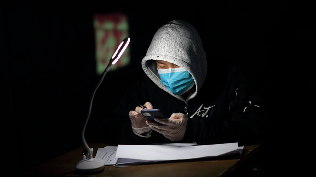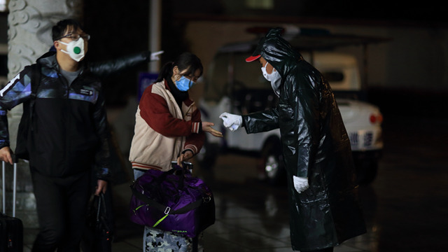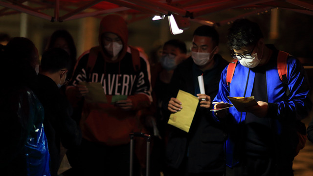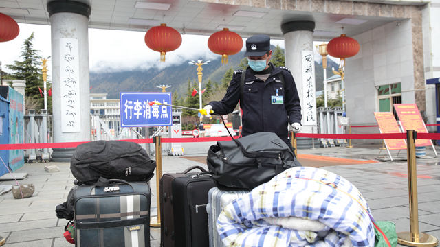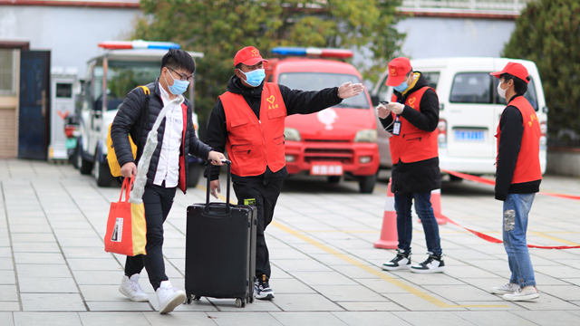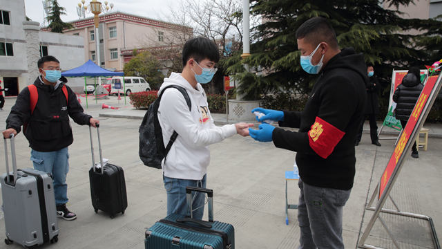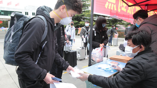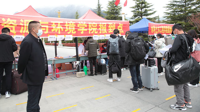 学生志愿者返校。安保处给学生志愿者行李消毒。