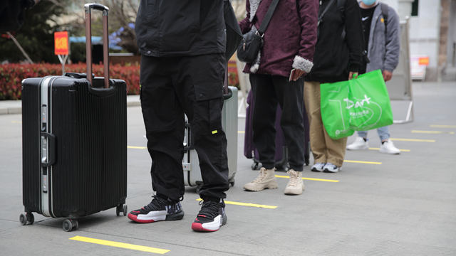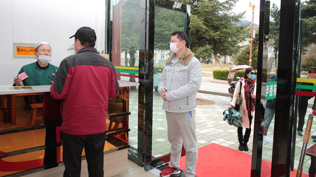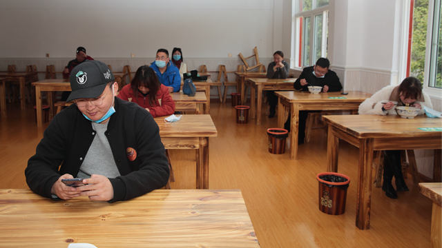 4月21日,学校新开张的面馆,需要测体温后排队进入。