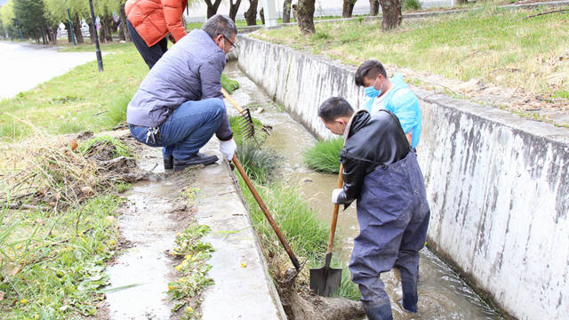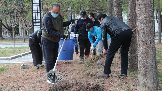 4月14日,为迎接学生返校,全体教工打扫校园。