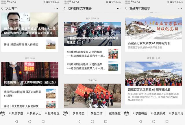 目前,经过全国人民的艰苦努力,付出了巨大牺牲,中国国内疫情防控形势持续向好,但我们仍然丝毫不能放松警惕。因此,广大师生的学习工作主要阵地仍在网上,各二级单位以纪念西藏百万农奴解放61周年为契机,积极发挥QQ、微信、各新媒体等平台作用,及时推出了一批正面积极、教育深刻的网上宣传作品,通过转发转载主流媒体信息资讯,编发主题宣传的文图、音视频等形式,大力宣传学习贯彻习近平新时代中国特色社会主义思想,宣传在全面打赢疫情防控阻击战中奋勇抗疫、贡献力量的典型,大力宣传西藏民主改革、西藏百万农奴解放的历史背景和现实意义,大力宣传师生在助力脱贫攻坚、推动乡村振兴中发扬“老西藏精神”“两路精神”和学院“筹建”精神的先进事迹,大力弘扬社会主义核心价值观和“四讲四爱”,积极营造全院师生学习践行习近平总书记系列贺信回信精神的热潮,分享本单位组织开展的学习宣传纪念活动情况和师生的感受感想等,并积极发挥网评员作用,加强舆论引导,引导师生凝聚网上共识、壮大正面声音。