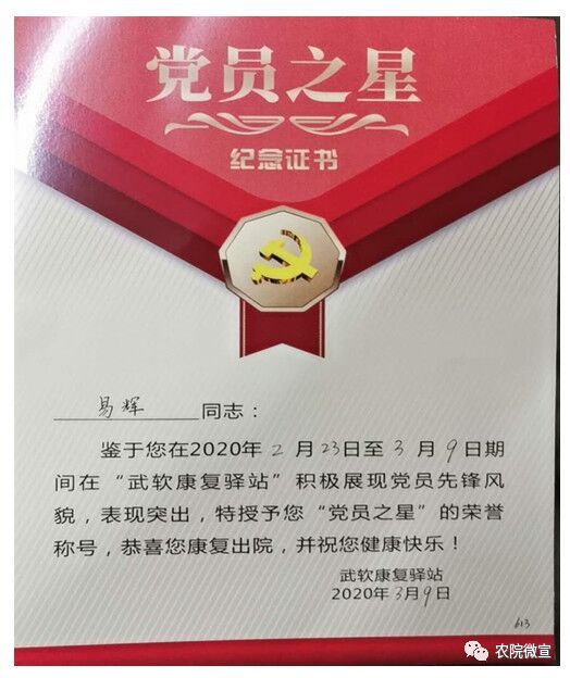 在恢复隔离期间,易辉同志和舱内与其他4名党员亮明身份,报武汉市武昌区政府同意,成立临时党支部,易辉同志担任支部书记。一名党员就是一面旗帜,一个支部就是一座战斗堡垒,党支部成员带领几名热心群众,主动承担病区内一些力所能及的工作,帮医务工作者和志愿者减轻负担,做好舱内160多名病人安抚疏导情绪,沟通反应情况解决问题,增强康复信心。支部工作得到武昌区政府肯定,易辉同志荣获“党员之星”称号。解除隔离后,易辉同志仍继续留在党员群里持续发挥作用,帮助新进舱人员克服困难,鼓励他们尽快恢复身体健康。