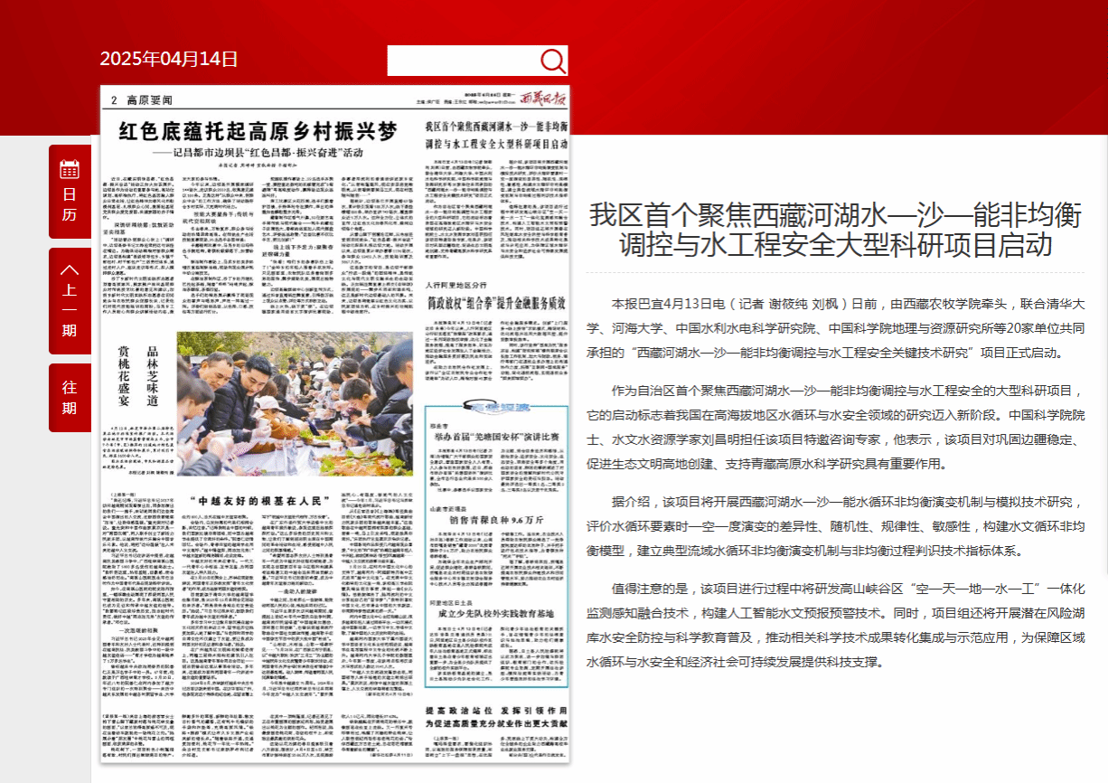西藏日报: 西藏首个聚焦西藏河湖水—沙—能非均衡 调控与水工程安全大型科研项目启...