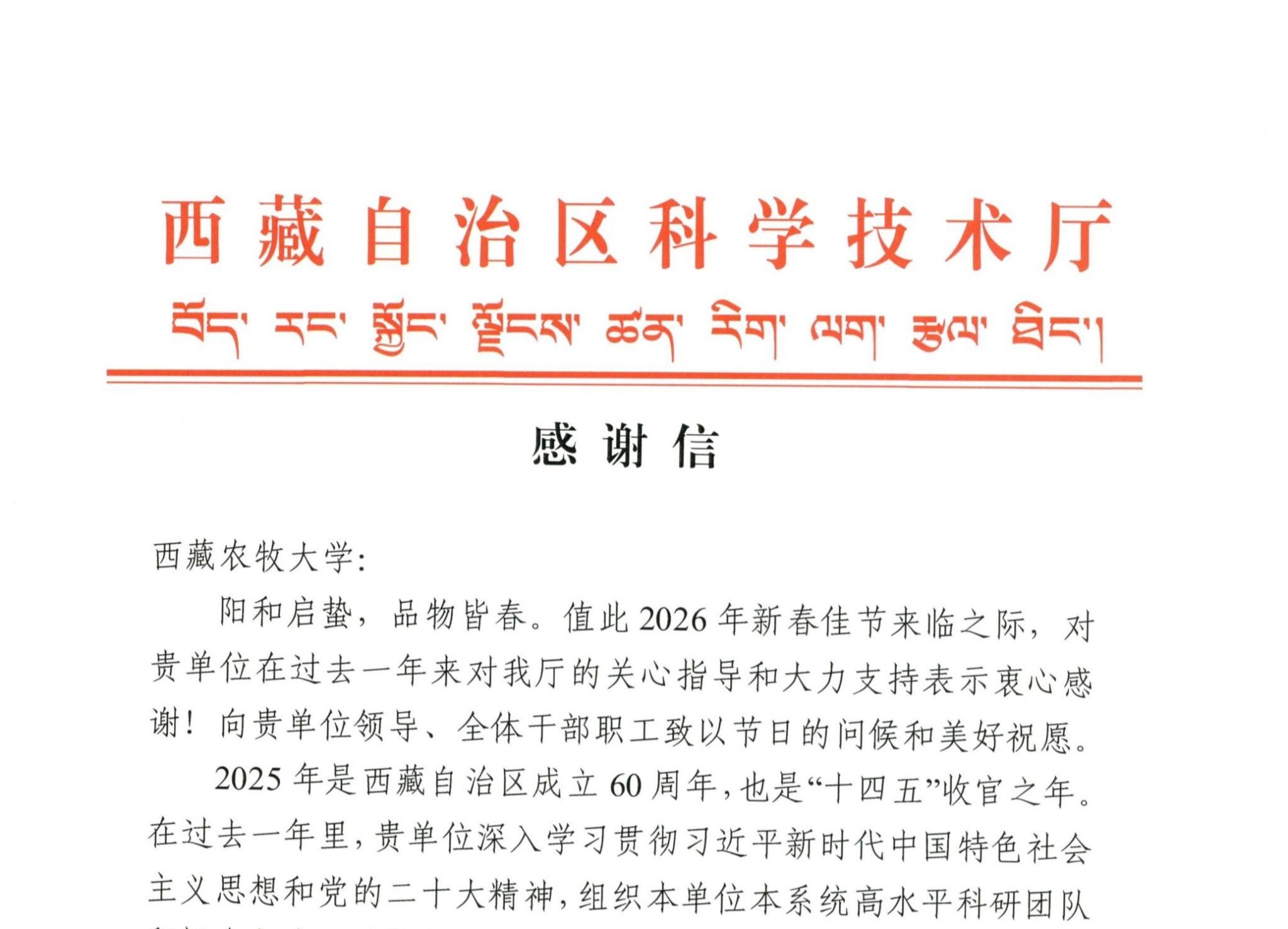 岁序更替,华章日新。在2026年新春佳节即将到来之际,西藏自治区科学技术厅专门致信我校,对我校在服务自治区“十四五”科技创新大局中展现出的高水平科研实力和强烈责任担当给予高度评价和诚挚感谢。信中指出,2...