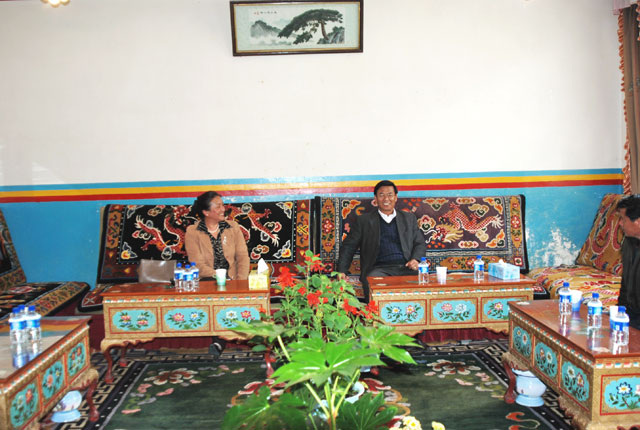 5月8日,林芝地委副书记、行署专员卓嘎到我院调研。图为院党委书记、副院长桑珠在介绍学院情况。