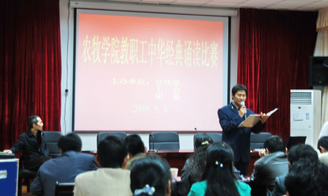 2008年9月5日晚,由院宣传部、团委、工会联合举办的教职工中华经典诵读比赛在图书馆会议中心举行,来自我院各单位、各部门的近20名选手参加了比赛。 经过激烈角逐,来自后勤管理处的次仁旺姆荣获一等奖;教务...