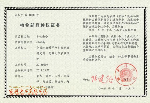 近日获悉,由中国林业科学研究院林业所与我院共同培育的胡桃科、核桃属植物――“中牧查香”被国家林业局授予植物新品种权,这也是西藏首个被国家林业局授予植物新品种权的乔木树种。 该品种分布于西藏山南地...