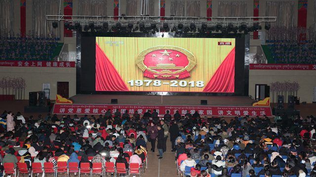 12月18日,庆祝改革开放40周年大会在北京隆重举行,西藏农牧学院无课师生二千八百余人在文体馆集体收看。 全体起立,高唱中华人民共和国国歌。 学校领导全部出席收看。 无课师生二千八百余人集体收看。