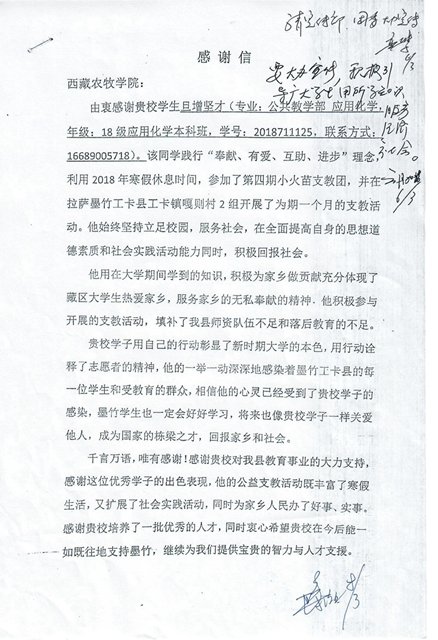 2019年1月,西藏农牧学院公共教学部2018级应用化学本科班旦增坚才同学利用寒假时间,积极参加拉萨市墨竹工卡县工卡镇嘎则村小火苗支教团,开展了为期一个月的基层支教活动,表现积极突出,受到当地各级有关部门及...