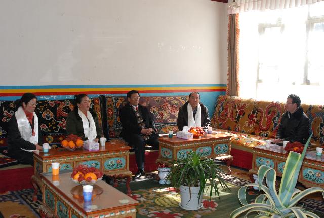 2011年2月3日下午,林芝地委副书记、行署专员卓嘎同志和林芝地区行署副专员顿吉同志到我校慰问。 卓嘎专员(左二)桑珠书记(正中)顿吉副专员(右二)副校长赵垦田(右一)丁惠霞副秘书长(左一)