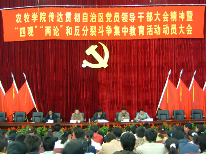 为进一步统一思想、提高认识,全面贯彻落实全区党员干部大会精神,5月29日晚,我院在学术报告厅召开全院党员领导干部大会,传达贯彻自治区党员领导干部大会精神暨“四观”“两论”和反分裂斗争集中教育活动动员大...