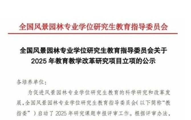 近日,全国风景园林专业学位研究生教育指导委员会(以下简称“教指委”)正式公布2025年教育教学改革研究项目立项名单,我校林草学院李文博副教授主持申报的研究项目获批立项。本次教指委共收到全国各培养单位限...