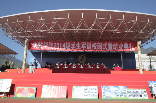 2014级学生军训校阅式暨结业典礼现场 院党委书记、副院长纪建洲向林芝军分区赠送锦旗 次旦平措院长检阅军训成果、慰问全体参训学生 郑维列副院长宣布西藏大学农牧学院2014级学生军训校阅式暨结业典礼开始 林...