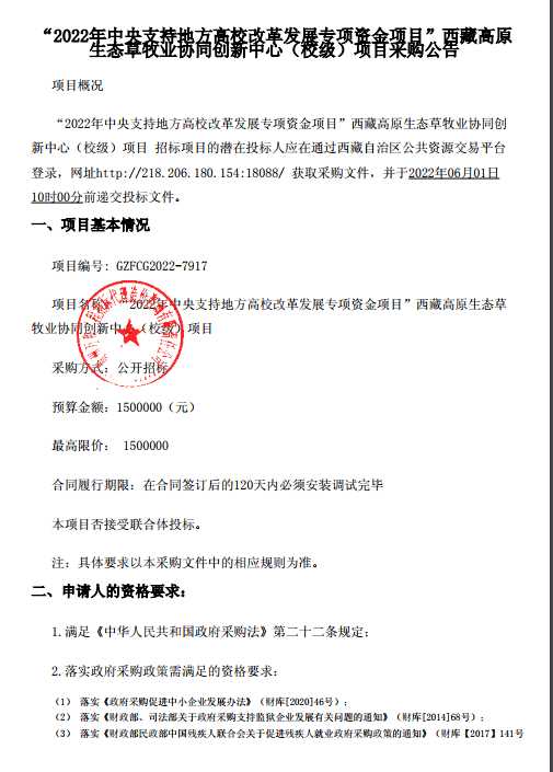 “2022年中央支持地方高校改革发展专项资金项目”西藏高原 生态草牧业协同创新中心(校级)项目采购公告