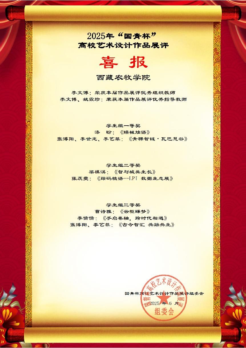 经组委会评审,园林2024级本科1班漆盼作品《蝶械烛语》获得绘画类一等奖,风景园林2024级研究生张博阳、李世龙、李艺菲《青稞智链·瓦巴慧谷》获得环境空间设计类一等奖,园林2024级本科1班梁棋淇美术作品《智与城共生长》获得绘画类二等奖,风景园林2024级风景园林张蕊雯研究生《绿码植语— LPI 数据生态展》获得环境空间设计类二等奖,园林2024级本科2班曹诗雅美术作品《云枢蝶梦》、李倩倩美术作品《手启卷轴,跨时代相遇》,风景园林2024级研究生张博阳、李艺菲、美术作品《古今智汇 共融共生》获得绘画类三等奖。通过参加本次比赛活动,极大的促进了我校学生专业能力水平的提升,充分体现了园林、风景园林专业学生的风采和精神面貌,凸显了园林一流专业建设和美育教育的成果。