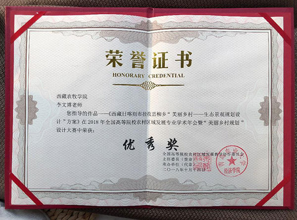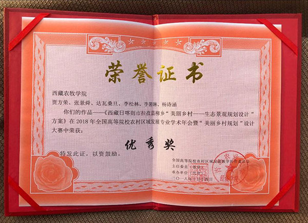 2018全国高等院校农村区域发展专业学术年会于2018年10月13—14日在青岛农业大学召开,由我校园林教研室李文博老师指导,园林专业16级本科班贾方荣、张景舜、达瓦桑旦、李松林、李箬琳、杨诗涵6名同学参与的规划设计作品——《西藏日喀则市拉孜县柳乡“美丽乡村——生态景观规划设计”方案》,经全国高等院校农村区域发展专业学术委员会、“美丽乡村规划”设计大赛组委会专家评审,荣获2018全国高等院校农村区域发展专业教学协作委员会颁发的“美丽乡村规划”设计大赛“优秀奖”。通过本次参赛拓展了学生的思维、增强了学生的实践动手能力和团队协作能力,为今后的专业教育和学生教育的创新理念增添了方式方法。