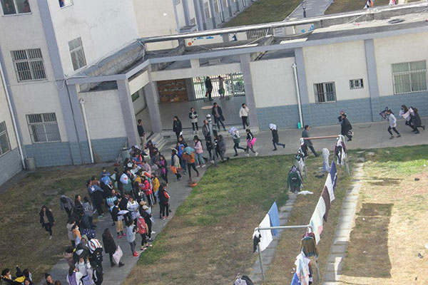 随着警报声的响起,平措顿珠老师发出演练开始指令,同学们快速、有序地依据规定的疏散路线用枕头保护好头、弯着腰,冷静、有序地沿着指定的安全路线快速撤离到了安全区,整个演习用了1分48秒。演练活动紧张有序,充分体现了快速、有序、安全的特点,演练达到了预期目的。