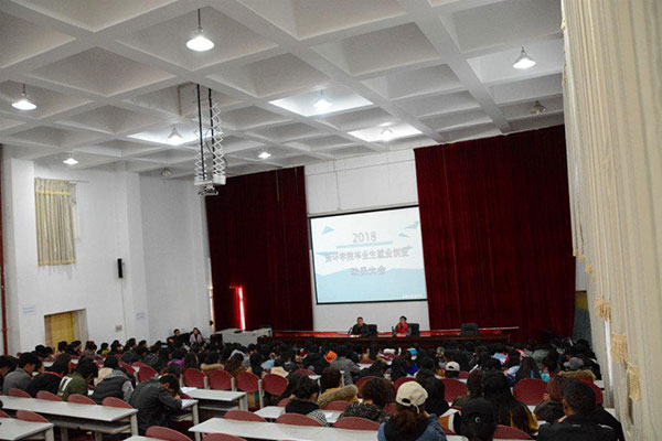 辅导员郭洋主持会议。伊始,普穷先对今年我院严峻的就业形势做出分析,紧接着分析了全区毕业生整体就业形势。并鼓励大学生应积极转变就业观念,目前就业压力大,不能仅仅将公务员作为人生的唯一出路;要充分利用对口援藏的央企招聘、“大众创业,万众创新”的好政策实现多元化就业,充分利用每一个机遇、每一个平台实现全就业。然后,普穷书记就2018年公务员报考及考试相关事项进行了强调,避免考生考试期间出现意外。并对毕业生提出以下三点要求:一、在校期间要严格遵守校规校纪,步入社会要做遵纪守法的好公民;二、要相信科学,有自己的主观意识,做到不信谣、不传谣、不造谣;三、无论何时何地都要好好学习,提高自身素质。最后,潘刚鼓励全体毕业生要相信天生我材必有用,无论遇到何种困难都要有一个乐观积极向上的生活态度,力所能及地为社会多做贡献。