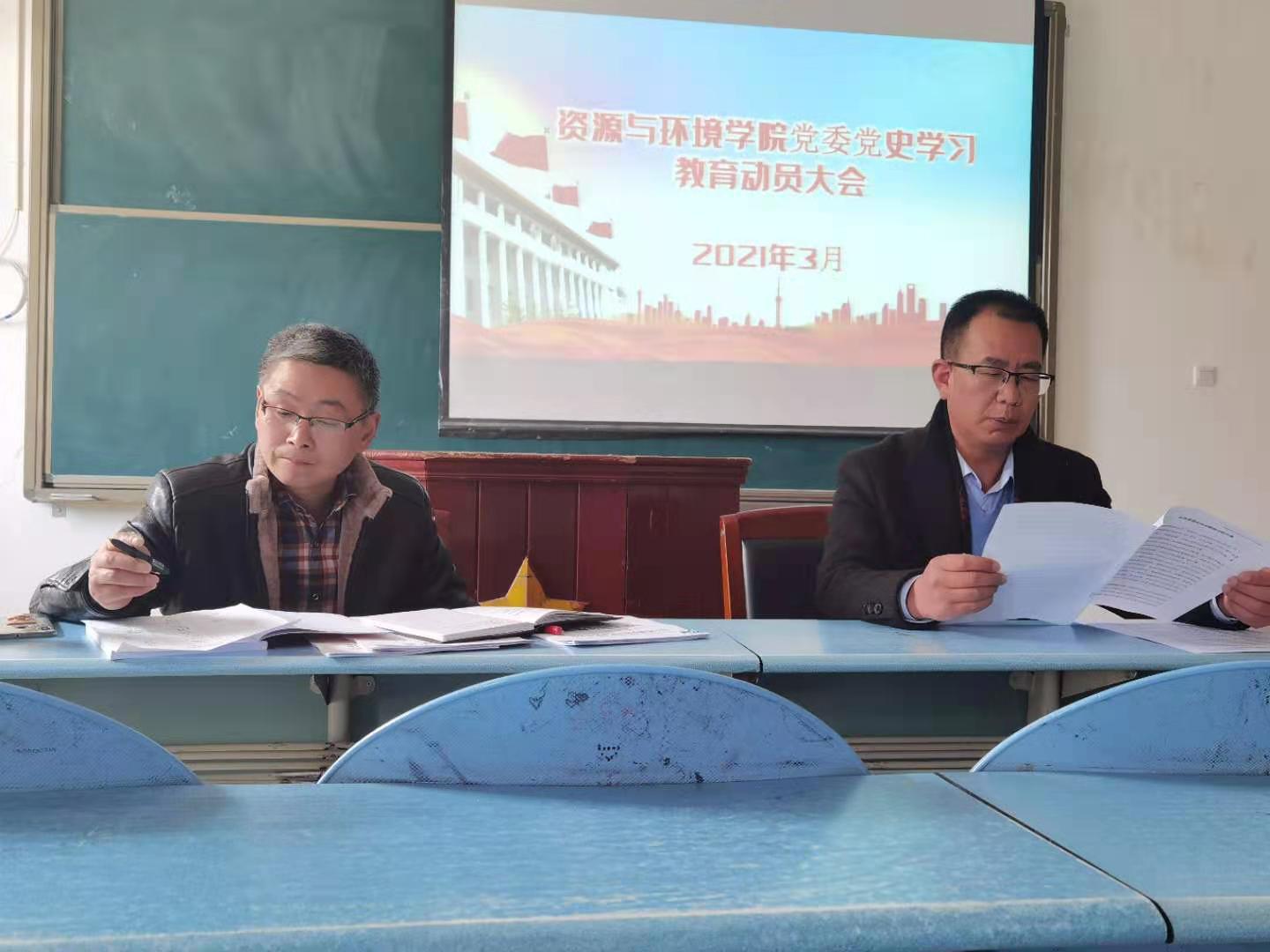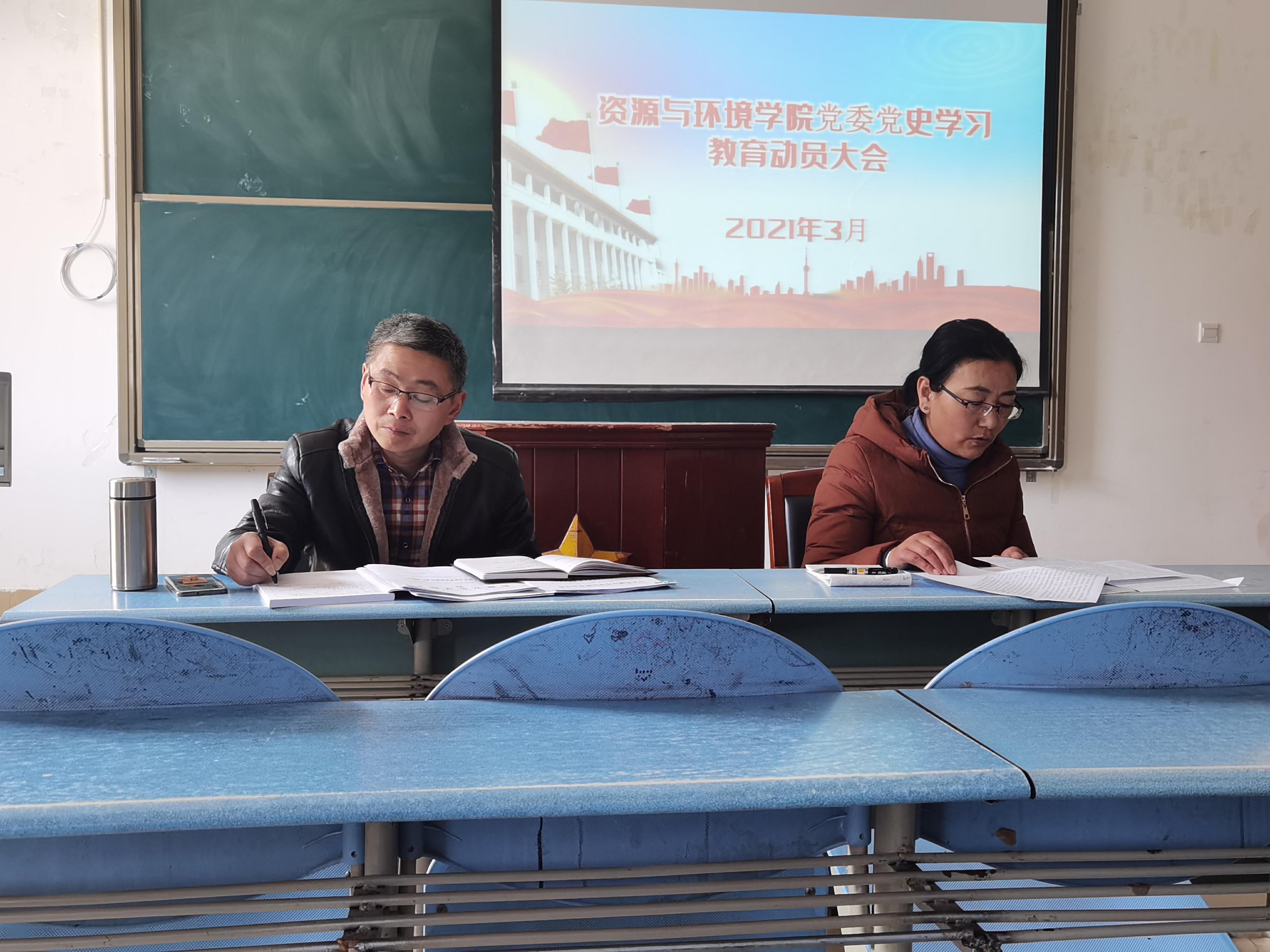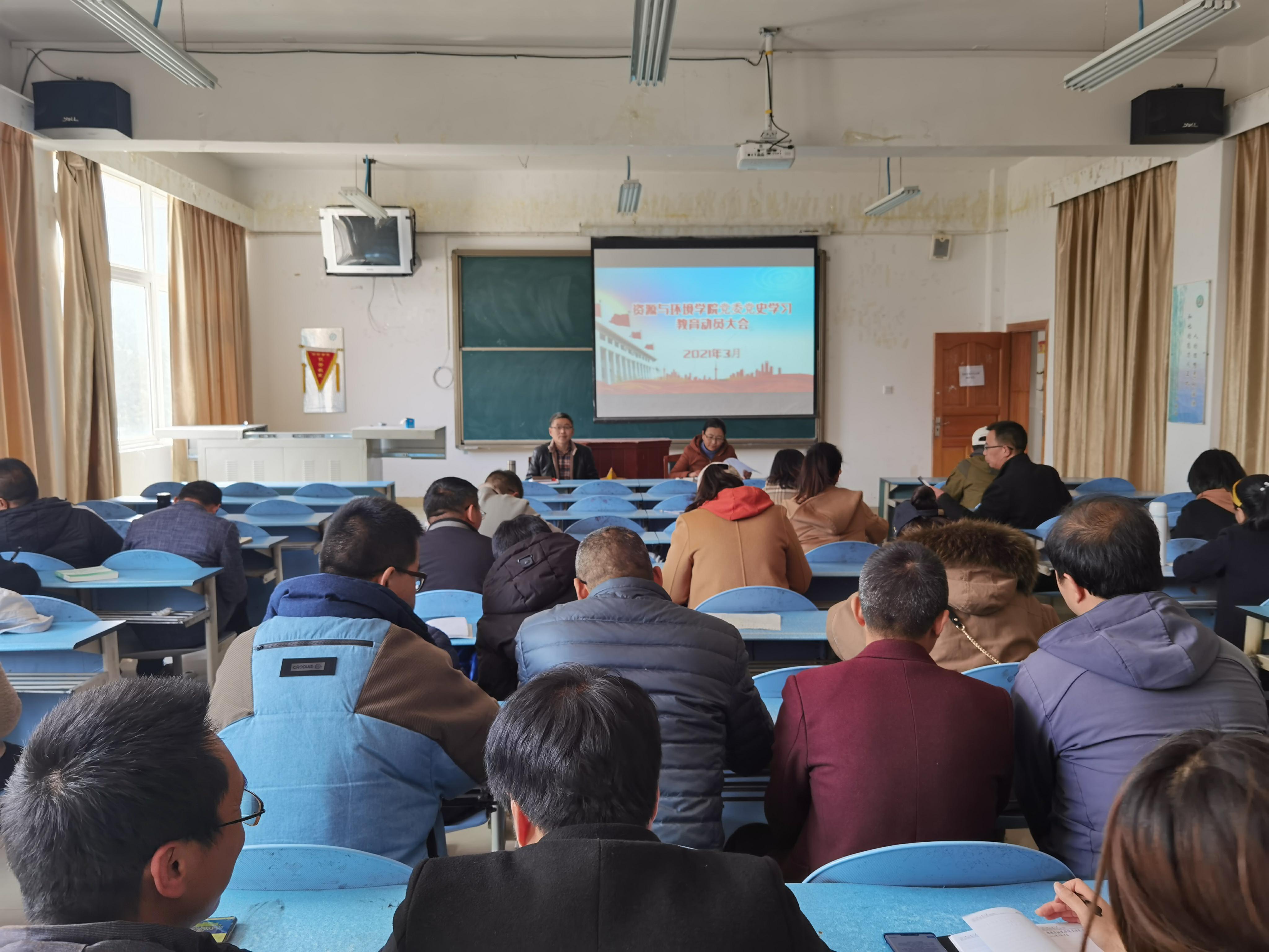 3月19日下午,资源与环境学院在3302教室召开党史学习教育动员部署大会,会议由邢震院长主持,学院全体教工参加此次会议。