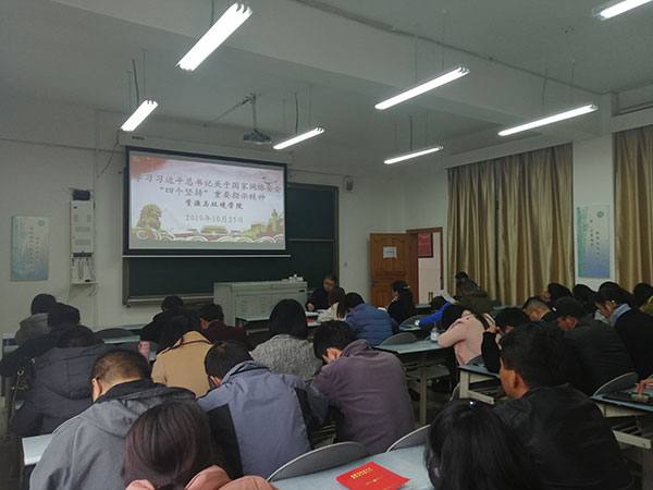 为学习贯彻习近平总书记关于网络安全工作重要指示、配合2019年西藏农牧学院宣传周工作, 2019年10月25日下午15点30分,在资环学院3307教室,召开了“不忘初心,牢记使命”主题学习活动。会议由资源与环境学院副院长王庆江主持。会议主题为“学习贯彻习近平总书记关于国家网络安全‘四个坚持’重要指示精神”资环学院院长邢震、副院长陈小强及全体老师参加了会议。