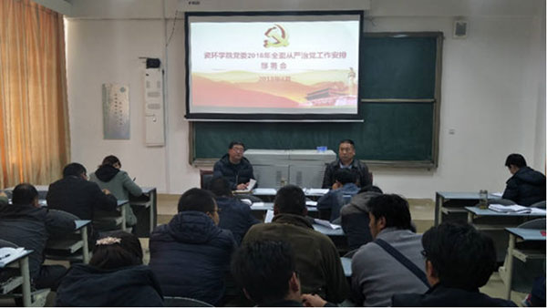 4月20日下午,资源与环境学院于三教3307教室召开2018年全面从严治党工作会议,深入学习贯彻习近平新时代中国特色社会主义思想和党的十九大精神,全面贯彻落实十九届中央纪委二次全会,自治区教育系统全面从严治党工作会议部署要求,分析研判学校全面从严治党形势,部署安排2018年全面从严治党工作的目标任务和工作要求。会议由资源与环境学院党委书记普穷主持,全体教职工参会。