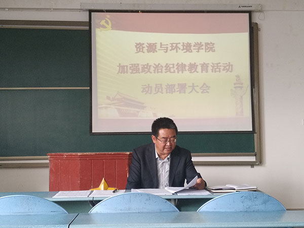 2018年8月24日下午15点30分,我院全体教职工在3302教室举行资源与环境学院开展加强政治纪律教育活动动员部署大会,会议由院长潘刚主持,全院职工参加此次大会。