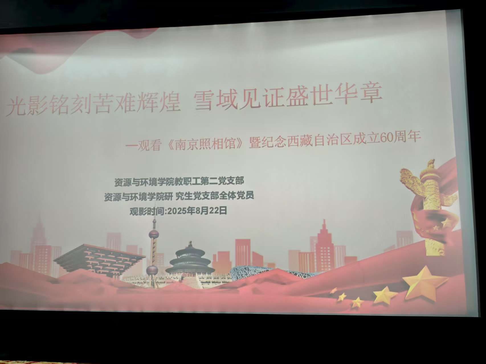 为庆祝西藏自治区成立 60 周年,传承红色基因,弘扬爱国主义精神,8 月 22 日,资源与环境学院教工第二党支部与研究生党支部联合开展了 “光影铭记苦难辉煌 雪域见证盛世华章” 主题活动,共同观看电影《南京照相馆》,并围绕西藏发展成就进行交流。此次活动旨在让党员们铭记历史,从先辈的抗争精神中汲取力量,同时深刻体会西藏 60 年来的沧桑巨变,激发党员们的责任感与使命感。