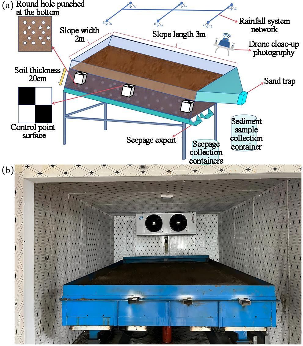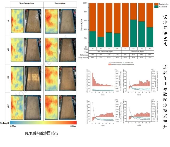 该研究聚焦于全球气候变暖背景下,高海拔地区面临的严峻生态挑战:短历时强降雨事件频发与冻融作用叠加,显著加剧坡面侵蚀风险。这一过程深刻影响着“世界屋脊”的水源涵养、生态安全和基础设施稳定。喻武教授团队依托西藏农牧大学水土保持人才创新基地,直面研究条件艰苦的挑战,采用了创新的研究手段:将高精度人工模拟降雨技术与无人机近景摄影测量技术相结合。模拟了极端短时强降雨(30分钟、80毫米/小时)条件下,不同坡度(5°、10°、15°、20°)的冻融与非冻融坡面侵蚀过程,并基于高精度DEM重建,实现了对片蚀与细沟侵蚀在冻融-强降雨耦合作用下的定量分离与精细识别。研究获得了一系列关键发现:(1)冻融作用使短时强降雨条件下的累计产沙量激增 28.1%–60.4%,输沙模数提升 29.1%–67.2%,定量印证了冻融是加剧侵蚀的关键驱动力;(2)冻融作用下,坡面泥沙来源由非冻融状态的片蚀主导,逆转为细沟侵蚀主导,其泥沙贡献率高达 63.9%–92.4%。这揭示了冻融对侵蚀过程的深刻重塑;(3)研究发现冻融效应在约10°坡度区间最为剧烈,强烈提示此坡度可能是冻融—短时强降雨耦合侵蚀的关键临界点,对灾害预警和防治具有重大指导意义。