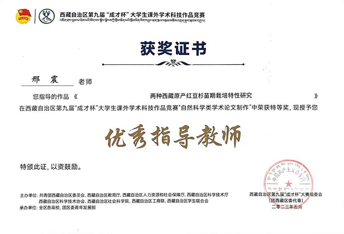 2023年6月2日在西藏自治区第九届“成才杯”大学生课外学术科技作品竞赛暨第十八届“挑战杯”西藏选拔赛决赛中,我院农业资源与环境专业2020级本科班高文于、顾琪、吕庆鑫等同学的《两种西藏原产红豆杉苗期栽培特性研究》一文荣获“自然科学类学术论文制作”特等奖,赢得进入国赛资格。邢震老师荣获西藏自治区优秀指导教师的荣誉称号。该成果受到国家级大学生创新训练项目“西藏两种红豆杉苗期抗寒性筛选”等的资助,对西藏原产的须弥红豆杉(Taxus wallichiana)和密叶红豆杉(Taxus fuana)从扦插繁殖、基质栽培、施肥试验、再到露地栽培等方面进行了较为系统的苗期栽培研究。完成研究论文4篇,其中已见刊和录用待刊3篇,待投1篇。