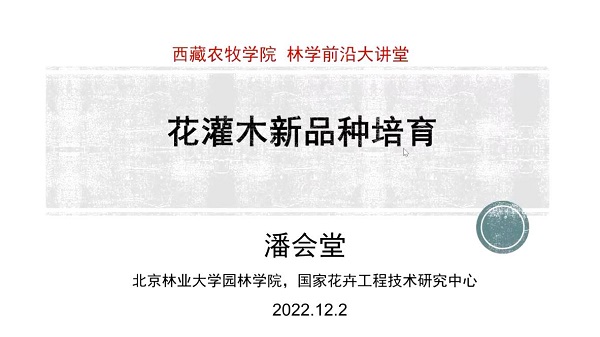 疫情不停研,为了更好地让全院师生了解到林学前沿研究成果与进展情况,资源与环境学院特别开展林学前沿大讲堂系列学术报告,此次大讲堂特邀北京林业大学、中国园艺学会副理事长潘会堂教授于2022年12月02日晚在腾讯会议作题为“花灌木植物新品种培育”线上学术报告。