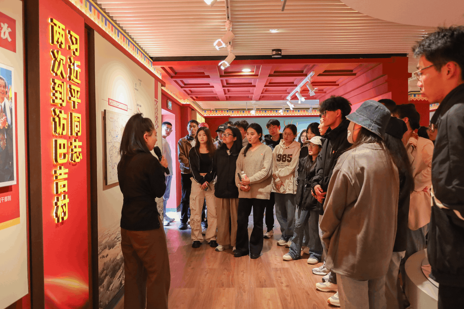 活动第二站,同学们来到了巴吉村“振兴颂”研学馆,同学们从一组组数据中详细了解到了巴吉村在乡村振兴战略实施过程中的产业发展、生态建设、文化传承等方面的成果和经验。在讲解员薛翔凤的带领下,同学们深刻感受到了乡村振兴给农村带来的巨大变化,也对乡村发展有了更深入的认识和思考。他们看到了巴吉村在党的领导下发生的翻天覆地的变化——从贫穷落后的小村庄发展成为如今生态宜居、产业兴旺的美丽乡村。