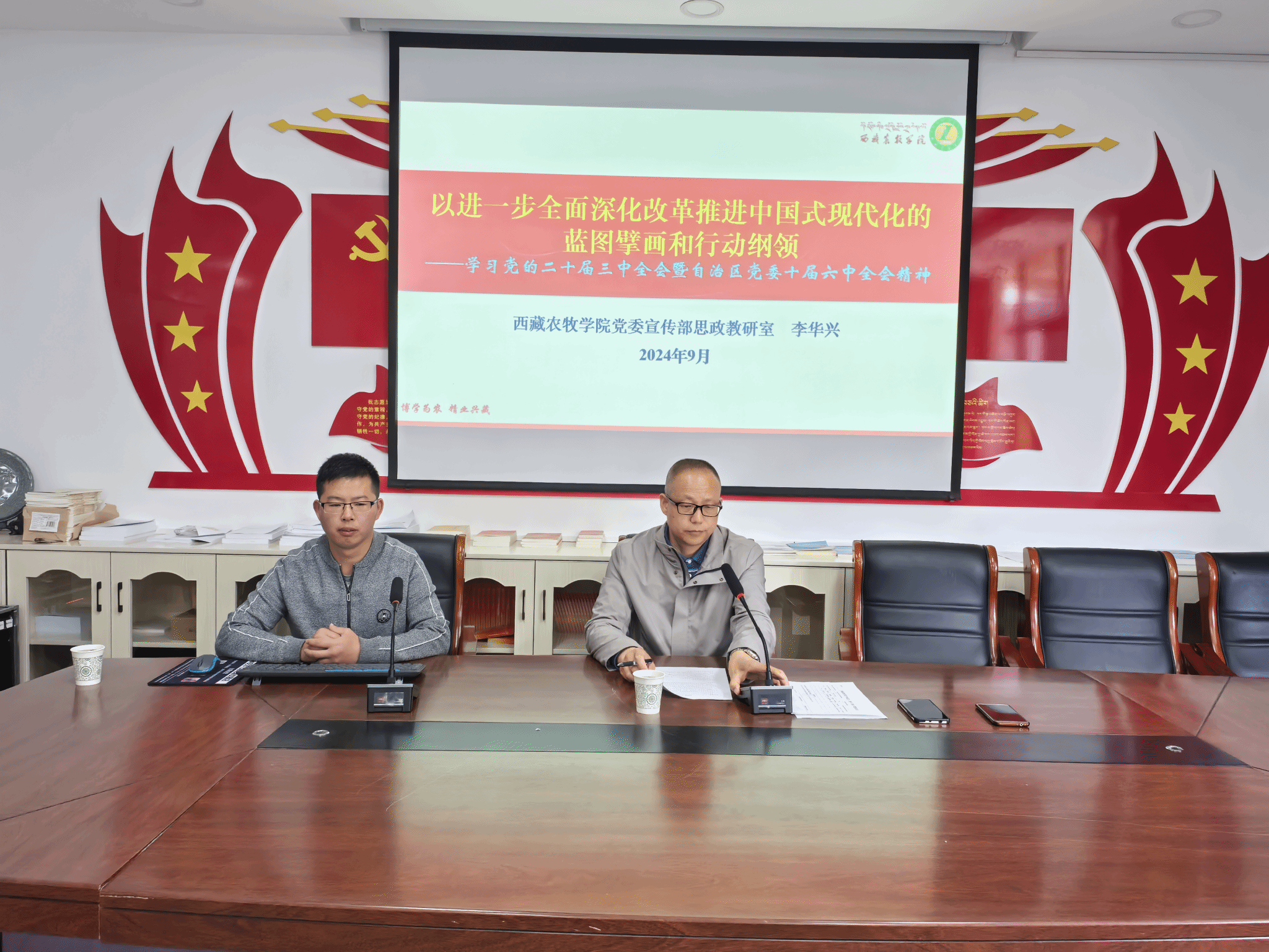 9月20日下午,资源与环境学院组织开展党的二十届三中全会和自治区党委十届六次全会精神宣讲学习活动。西藏农牧学院党委宣传部、思想政治教研室副教授李华兴受邀作专题宣讲报告。资源与环境学院院长孙自保主持报告会。资源与环境额学院全体无课教职工共40余人参加宣讲报告会。