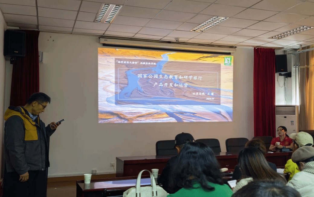 王蕾博士作了题为《国家公园生态教育和研学旅行产品开发和运营》的学术报告。结合自身多年来的生态教育实践,围绕生态教育的本质,以三江源国家公园为例,从国家公园的使命、生态产品价值实现、自然教育、研学旅行、产品开发、环境保护、生态线路设计、社会参与管理、学术研究、运营管理等方面,系统地介绍了国家公园生态教育和研学产品的开发与运营,为我院师生开阔了眼界,为专业研究拓展了思路。参会师生从自己的研究角度提出了相关问题。李耀明副院长就国家公园与“四生”的关系以及促进,陈学达老师就自然教育本地客源市场产品开发,研究生邢会睿就西藏保护地生态产品开发与生态环境保护等方面进行了提问,王蕾博士一一进行解答,并积极同与会师生进行了探讨。