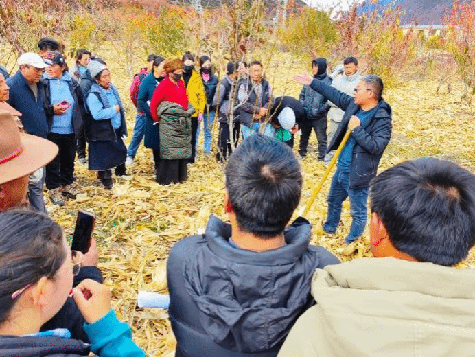 为深入推动生态文明建设,践行绿水青山就是金山银山理念,推动“十四五”期间筑牢生态安全屏障、保护生物多样性,充分发挥科技引领作用,也为答谢波密县政府及相关部门对我校资源与环境学院的大力支持,科技部“西南高山峡谷水土流失综合治理技术与示范“项目中专项项目”山地多年生特种经济植物水土保持培育技术”负责人副院长万丹教授,于2024年11月19日带队前往波密县倾多镇果园对农牧民进行“山地多年生特种经济植物水土保持培育技术项目”现场培训。波密县林业和草原局、倾多镇政府工作人员及我校德庆措姆老师、大布穷老师和叶彦辉老师共同为90余名农牧民代表进行经济林栽培与抚育方面的培训。