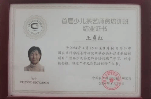 团队导师王贞红分别于2023年获得高级评茶师技师资质、2024获得首届少儿茶艺培训师资质,在2024年全国行业职业技能竞赛——第七届全国茶业职业技能竞赛评茶项目总决赛获得铜奖。