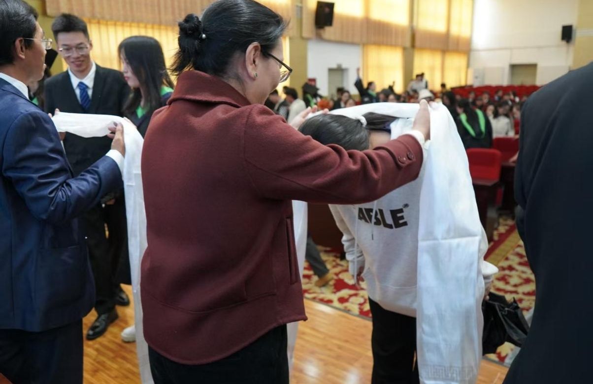 会议结束后,与会领导与老师为全体毕业生一一献哈达,赠送毕业生礼包,并邀请学校领导同广大师生合影留念。