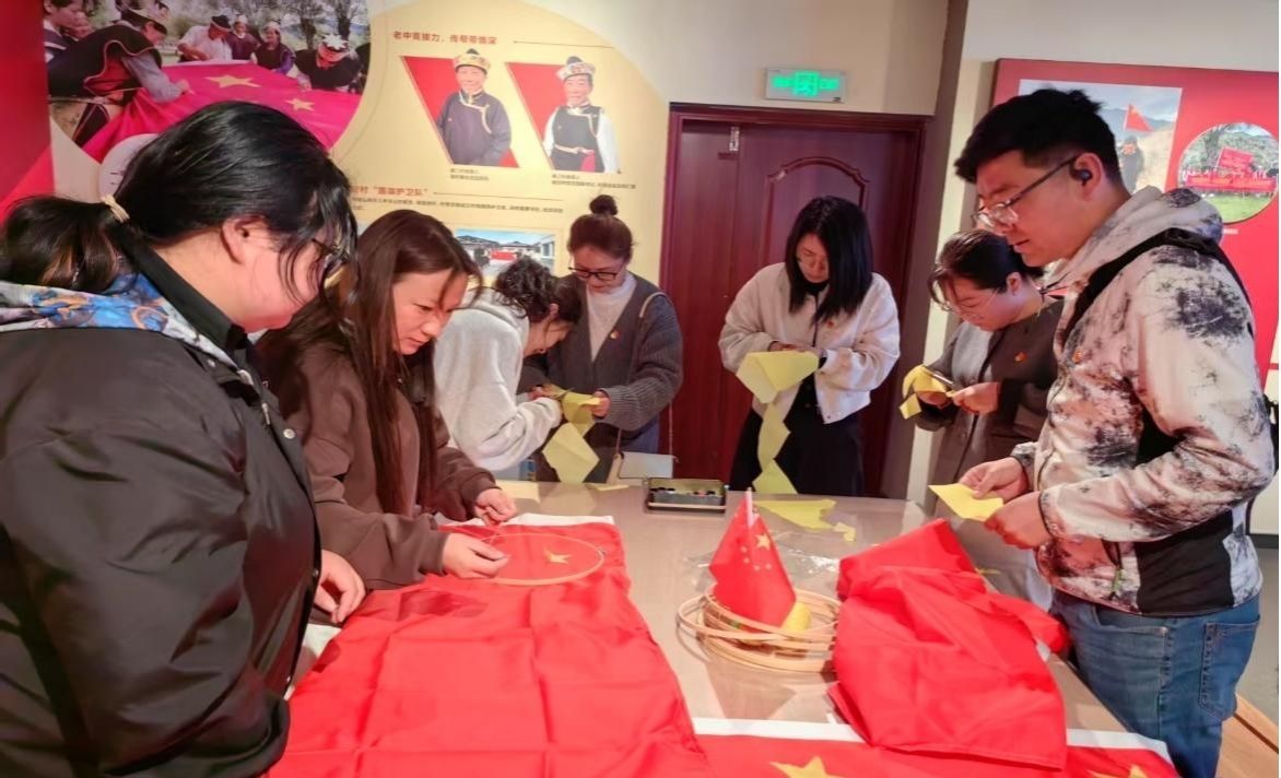 随后,教师们前往立定村解放颂研学馆。在这里,跟随着讲解员的脚步,从缝制一面国旗的历史故事开始,了解了立定村的红色文化、影视文化和生活生产文化。展馆中通过物品陈列、场景复原、多媒体展示等多种形式,全方位、多角度地呈现了在党的领导下立定村创造美好生活的奋斗历程,让教师们仿佛身临其境,更加直观地感受到今天美好生活的来之不易。最后,在讲解员的指导下,支部党员共同体验合作完成了一面国旗的缝制,并与亲手缝制的国旗进行合影。