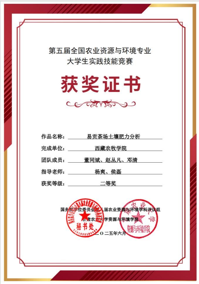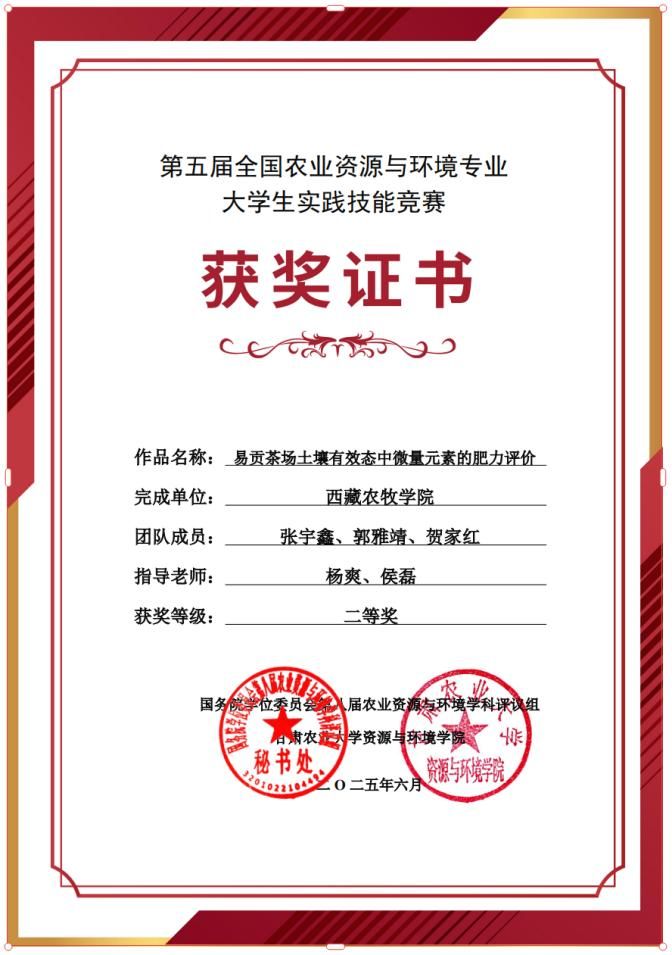 2025年4-6月,我校6名本科生荣获第五届全国农业资源与环境专业大学生实践技能大赛荣获全国团体二等奖。本次大赛由国务院学位委员会第八届农业资源与环境学科评议组主办,甘肃农业大学资源与环境学院承办单位。以“强化农资人才技能培养,提升绿色农业新质 生产力”为竞赛主题,聚焦土壤健康与指标检测、微生物技术与土壤固碳、肥料检测与绿色施肥,通过对相关实验技能和理论知识的考察,旨在进一步培养学生“知农、学农、爱农”的观念, 提高学生解决农业绿色生产实践问题的能力。