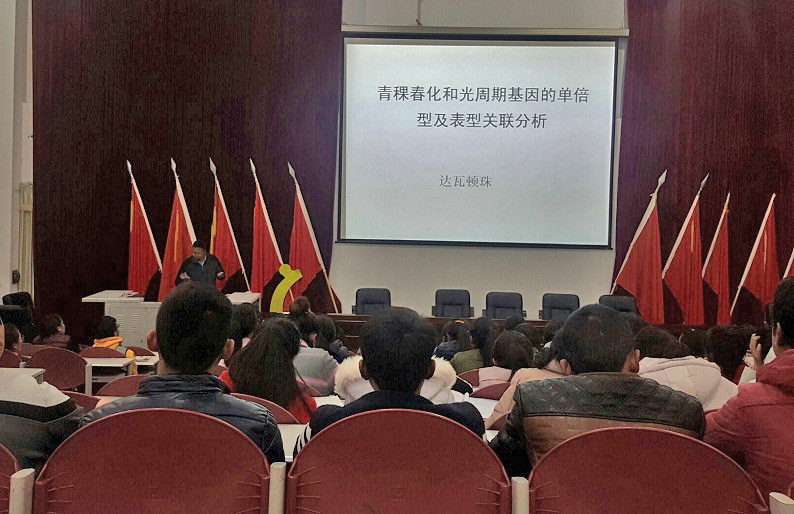 达瓦顿珠博士利用通俗易懂的语言,从青稞生产现状、分布特点、影响青稞特性的春化等位基因(VRN1、VRN2、VRN3)、光周期等位基因(PPD-H1、PPD-H2)的筛选鉴定以及利用此基因对西藏青稞进行验证等方面进行了详细的讲解,并同部分教师、学生进行了详细的探讨。最后,达瓦顿珠博士以自己在大学班上倒数后几位的成绩而勇于考研的经历向农学专业学生提出了殷切的希望:即不怕基础差,认准目标,排除困难,进一步深造攻读硕士、博士学位,提高能力。通过讲座,进一步提升了农学教研室教师的科研意识,增强了农学专业学生参加科研的意愿,对农学专业学生努力学习,提高能力起到了积极作用。