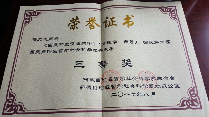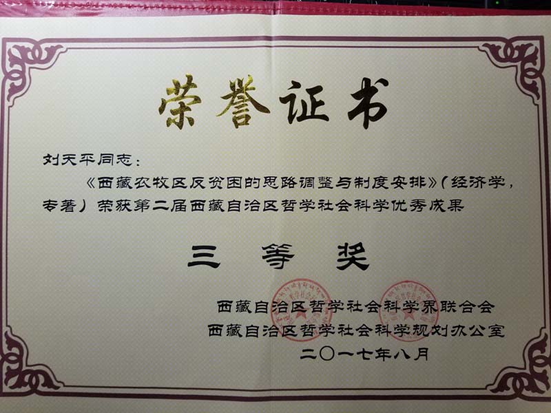 西藏自治区哲学社会科学优秀成果奖每两年评选一次,由西藏自治区哲学社会科学界联合会和西藏自治区哲学社会科学规划办公室联合颁发。2017年主要奖励2015年1月1日至2016年12月31日公开出版、发表并享有著作权的优秀学术著作、论文、研究报告和理论普及成果等,全区共评出一、二、三等奖29项,农经教研室申报的2项成果均获奖。