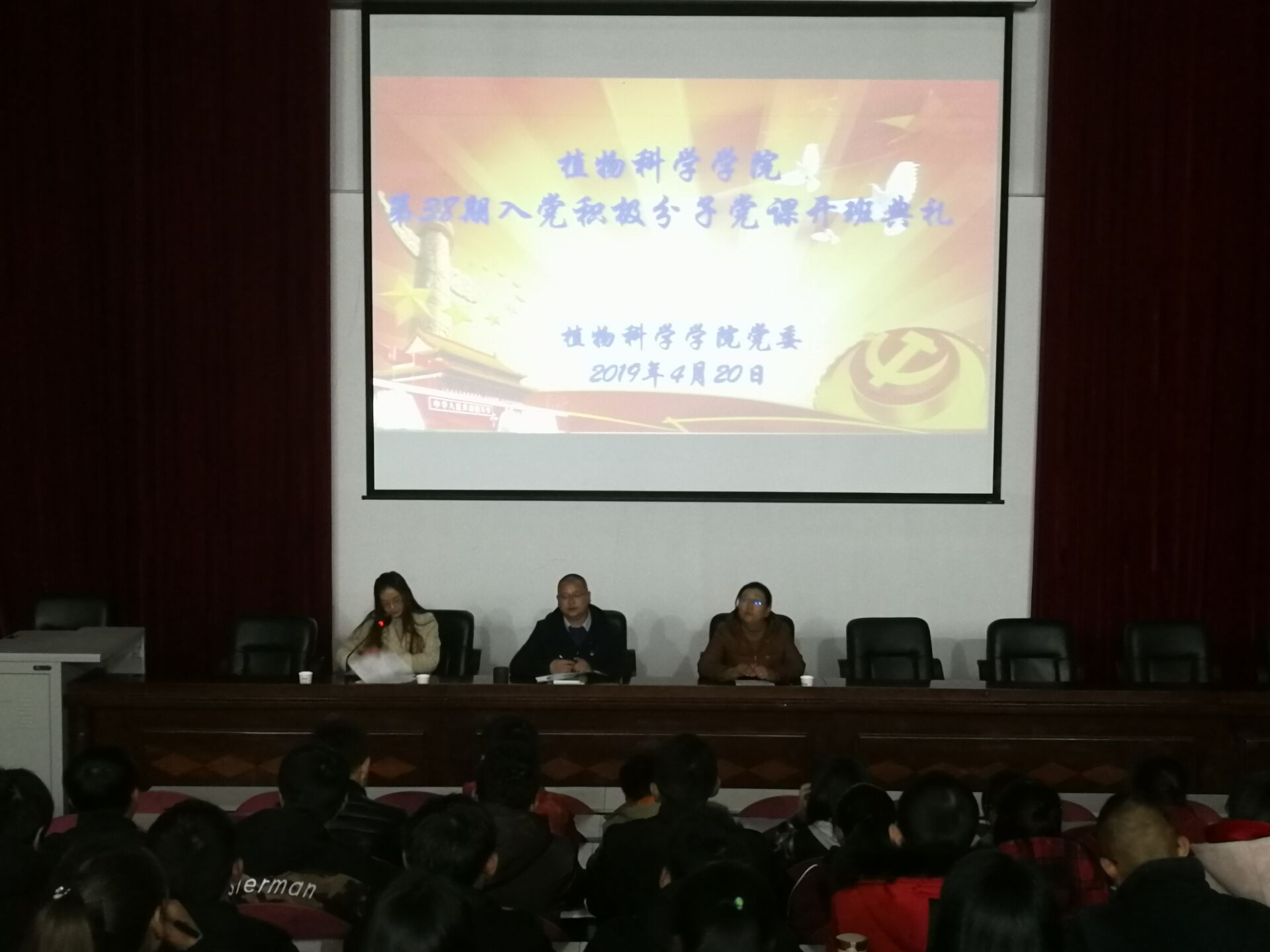 为学习贯彻“四讲四爱”重要精神,践行“两学一做”常态化制度化要求,加强学生思想政治教育,普及党的知识,进一步加强入党积极分子教育培训工作,提高入党积极分子的思想觉悟和理论素养,秉承对入党积极分子的严格要求,植物科学学院学生党支部于2019年4月20日19时在2017教室隆重举行第38期入党积极分子党课开班典礼。植物科学学院党委书记次仁吉、副书记王元林出席此次开班典礼,王倩倩老师主持,共计153位学员参加。