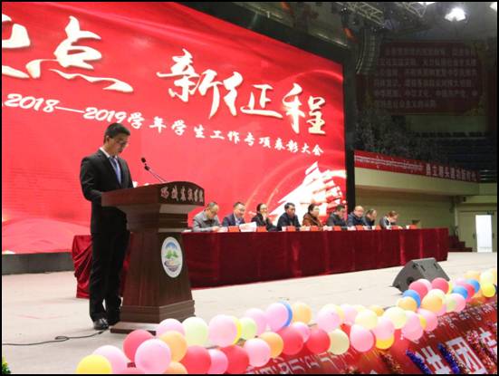 1.全体师生起立奏唱国歌;2.学院党团学学生干部负责人做2018-2019学年度学生工作汇报,他们每个人都精神抖擞,慷慨激昂的做了工作汇报,总结了优点和缺点,并对未来进行了谋划;3.院党委副书记王元林宣读表彰决定;4.学校及学院领导为先进集体、先进个人颁奖;5.学生代表农林经济管理2016级本科1班潘峰同学致获奖感言;6.党委副书记王元林做2018-2019学年学生工作总结。