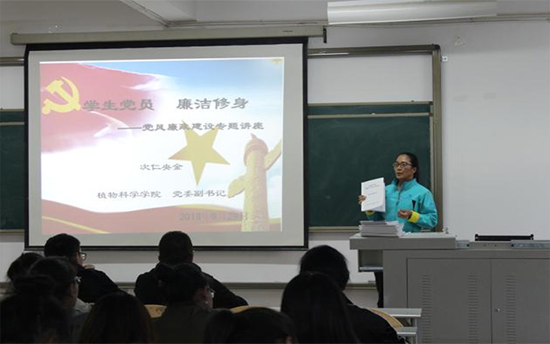 为使党风廉政更加彻底的深入基层,让每个党员都了解到党风廉政建设的重要性,让每个学生党员都参与到党风廉政建设的过程中,植物科学学院于2018年9月29日晚19:00在2312教室进行了“加强学生党员廉洁修身”的党风廉政建设的专题讲座,由植物科学学院党委副书记次仁央金为主讲人,植科院学生党员、预备党员共计80人参加此次讲座.