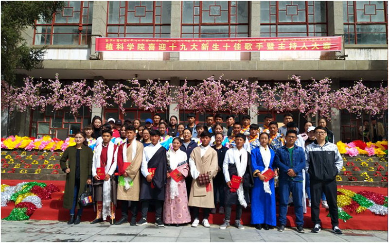 为喜迎党的十九大胜利召开,丰富学生课余生活,培养学生综合能力素质,认真践行“四讲四爱”主题教育实践活动的要求,于2017年10月8日10时30分在老礼堂前举行了以“喜迎十九大”为主题的新生十佳歌手暨主持人大赛。由植物科学学院党委书记次仁吉,党委副书记次仁央金,学生科辅导员毛小军、次仁旺姆、王倩倩、崔鹏宇、秦丽,学生代表潘峰、何乃志担任评委。