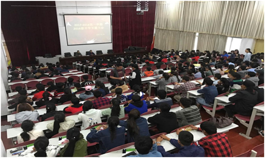 为了学生重视日常学习,践行“讲文明爱生活”,进一步加强学院学风建设,植物科学学院领导班子,于2017年8月23日上午召开党政联席会议,研究决定在15、16年级中,开展学业警示及加强学习制度管理专题教育。要求学习传达“关于15、16级毕业清考未过学生重修工作的通知”及学院相关要求,统一进行学业警示教育。会议由植物科学学院党委副书记次仁央金主持,16级联系分管领导植物科学学院书记次仁吉和教学主管副院长达红旗(负责15年级)主讲,15级联系分管领导院长王中奎、教学科科长洛桑云旦、分管年级辅导员毛小军、秦丽及15、16级全体学生参加会议。