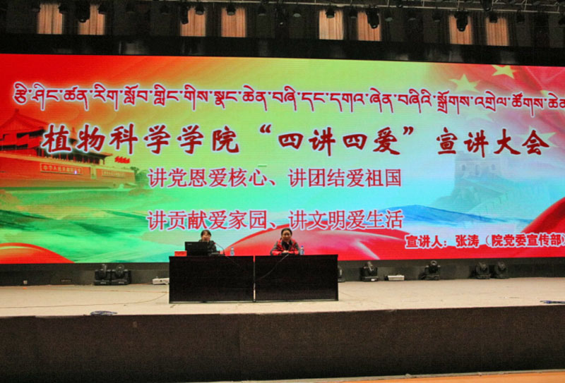 根据习近平总书记系列重要讲话精神和“治国必治边,治边先稳藏”新战略,以及院党委“四讲四爱”喜迎党的十九大主题教育实践活动实施方案,我院组织全院学生1200余人于2017年5月7日15:30在文体馆举办了植物科学学院“讲党恩爱核心,讲团结爱祖国,讲贡献爱家园,讲文明爱生活”宣讲大会。会议由我院党委书记次仁吉主持,由宣传部张涛老师宣讲。