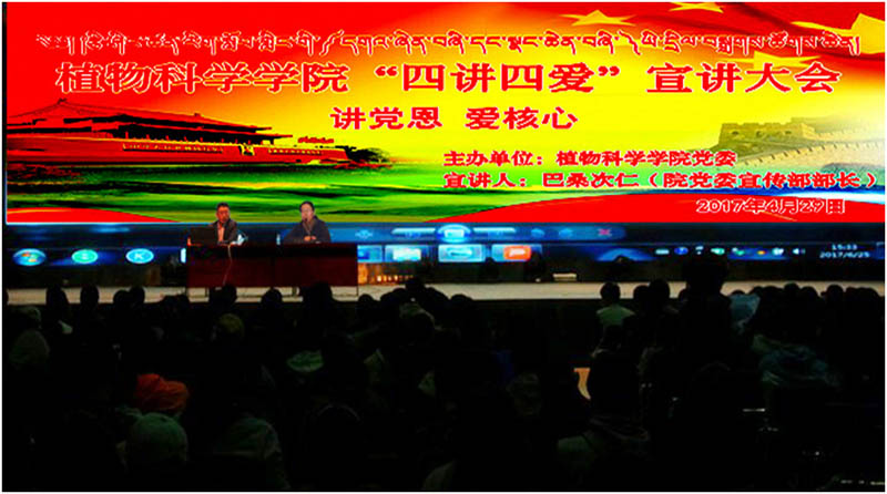 2017年4月29日植物科学学院在校文体馆举办了“四讲四爱”之“讲党恩爱核心”主题宣讲大会。会议由植物科学学院党委书记次仁吉老师主持,院党委宣传部部长巴桑次仁主讲,植物科学学院全体师生960余人参加。