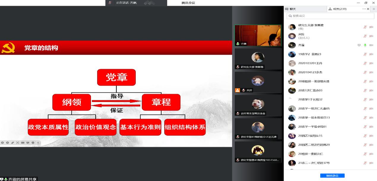 为了深入学习贯彻党的二十大精神,学习领会新修订《党章》的主要内容,根据植科学院党委的学习计划和安排,2022年11月30日晚上7:30,我院党委特别邀请学校宣传部思政教研室的齐霜副教授为我院师生党员、入党积极分子宣讲了新修订《党章》。党课以腾讯会议形式开展,由学院党委书记达瓦主持,学院120多名党员、入党积极分子参加。
